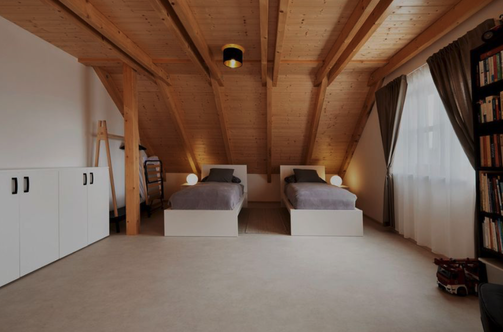 Napravo od schodů se nachází největší ložnice (D), která je vybavena jednou manželskou postelí s nočními stolky a osvětlením a dvěma jednolůžkovými postelemi. Centrem ložnice je knihovna vybavená knihami náročnější i odpočinkové literatury k volnému čtení pro dospělé a knihovnička pro děti s hračkami.